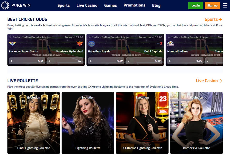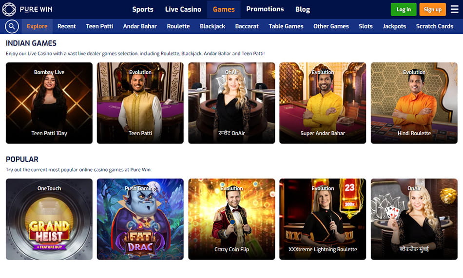 इसके गेम्स बेजोड़ हैं, और यहाँ भारत में प्रसिद्ध गेम्स जैसे कि – Hindi Roulette, Andar Bahar, Teen Patti, Blackjack Mumbai, Poker, Bingo आदि सभी कुछ मिलता है। स्पोर्ट्स बेटिंग पर अच्छे ऑड्स भी मिलते हैं। इनका स्वगत बोनस काफ़ी अच्छा है और साथ ही इनके दैनिक, साप्N8बोनस ऑफ़र – रजिस्टर करें और जीतेंताहिक और मासिक बोनस और प्रमोशन, पूरे Pure Win ऑनलाइन कैसीनो अनुभव में रोमांच और थ्रिल को बढ़ाता है!